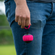 Pak de ring aan het touwtje, draai rond en gooi de bal ver weg. Het touwtje rolt vanzelf op in de bal. De ribbels in het rubber masseren het tandvlees en helpen het gebit te reinigen.