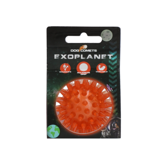 Deze bal vol met stevige maar flexibele ‘stekels’ zorgt voor urenlang speelplezier en helpt tegelijkertijd het gebit te reinigen! De Dog Comets Exoplanet stuitert perfect, drijft op water en is dankzij de stekels makkelijk vast te pakken. Deze eigenschappen zorgen ervoor dat de bal erg geschikt is voor het apporteren en om mee te spelen in het water. Als de hond de bal in de bek vastpakt, dan masseren de stekels het tandvlees en ze helpen de tanden te reinigen. De pieper in het midden zorgt voor extra stimulans tijdens het spelen.