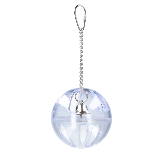 Deze duurzame bal kan steeds opnieuw worden gevuld met bijvoorbeeld de favoriete snacks of speeltjes van de vogel.