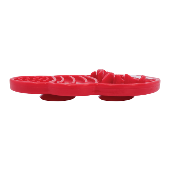 Plaats de likmat op de grond of bevestig deze met de zuignappen aan een gladde muur of ander oppervlak. Vul de likmat met de gewenste lekkernijen of met hondenbrokken. De dikke richels zijn perfect om brokjes en snacks op of tussen te leggen, terwijl de nopjes goed smeersels (zoals pindakaas) vast kunnen houden. Was de likmat uitsluitend met de hand na gebruik.