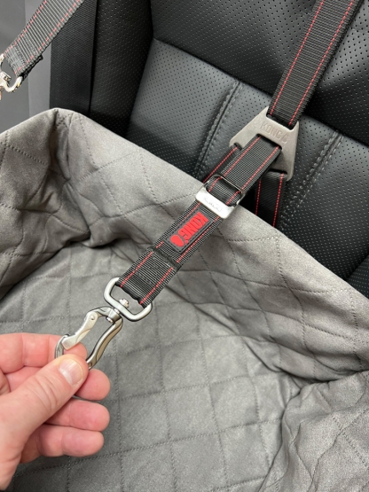 - Met draaiende karabijnhaak, voorkomt dat de hond uit de auto springt
