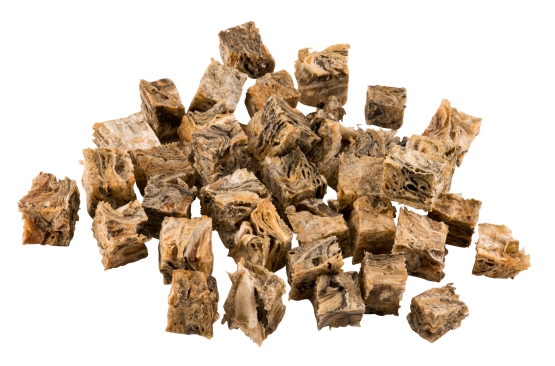 Braaaf Vissnack Zalmhuid Blokjes is 100% lucht gedroogde wilde zalm, met slechts 3,8% vet. Zalmhuidblokjes bevatten essentiële omega 3 vetzuren voor een gezonde huid en vacht. Vissnacks van Braaaf bevatten geen toegevoegde kunstmatige geur-, klaar en kleurstoffen. Een snack van zalmhuid heeft naast het kauwplezier een reinigende werking op de tanden.