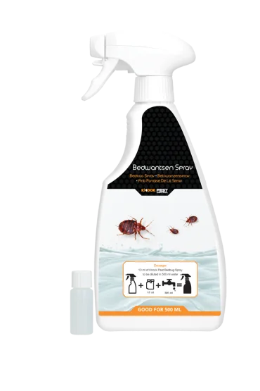 Knock Pest Bed Bug Spray is an easy to dilute concentrate with water. After spraying, the silicone polymers dry up and form a 3-dimensional polymer network. This prevents the bedbugs from moving, resulting in death.