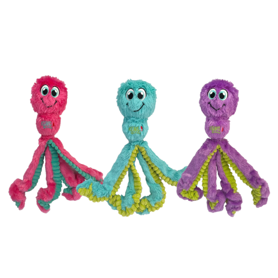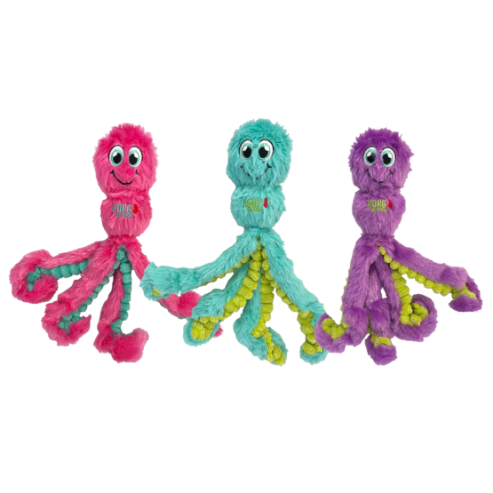 The dangling legs and long, floppy body of Kong Wubba Octopus make it ideal for shaking back and forth. The squeaker provides additional stimulation. Ideal for pulling, shaking and fetching indoors. This adorable undersea friend is also great to cuddle with, thanks to its super soft plush. Minimal padding for less mess. Toys come assorted.