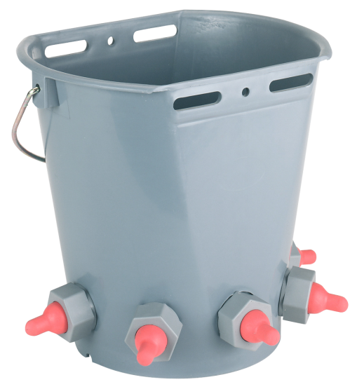 Grijze emmer tweezijdig plat met 5 grote gaten om daarin korte spenen te bevestigen.