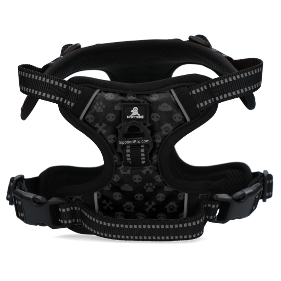 Dit harnas voor honden is speciaal ontworpen in samenwerking met professionals. Het NO-Pull (anti trek) harnas is gemaakt van premium materialen en is speciaal ontworpen om druk te verdelen over het lichaam van de hond voor een optimaal draagcomfort. Het harnas is verstelbaar op 4 punten voor de perfecte pasvorm. Door het gebruik van materiaal dat normaal wordt gebruikt voor reddingsoperaties of bergbeklimmen, is de kwaliteit van het harnas gegarandeerd. Er zijn 2 metalen ringen aanwezig waar u eenvoudig uw hondenriem kunt bevestigen. De bovenste ring is voor honden die niet of nauwelijks trekken en voor trekkende honden kunt u de ring aan de borstzijde gebruiken. Dit zorgt ervoor dat de borstkast van de hond meer onder druk komt en hierdoor trekt de hond minder, daarom wordt dit harnas ook wel het NO PULL harnas genoemd. Dit is een veel vriendelijkere manier om honden die trekken tegen te gaan dan een slipketting of normale halsband. Het harnas is ook voorzien van een handvat, waardoor u uw hond in drukke of stressvolle situaties gemakkelijk onder controle kunt houden. Reflecterende elementen zorgen voor optimale zichtbaarheid in het schemer of in het donker, waardoor u veilig kunt wandelen met uw hond. Door het unieke ontwerp is het Spotted Pro harnas eenvoudig te verwijderen bij zowel jonge als oude honden.