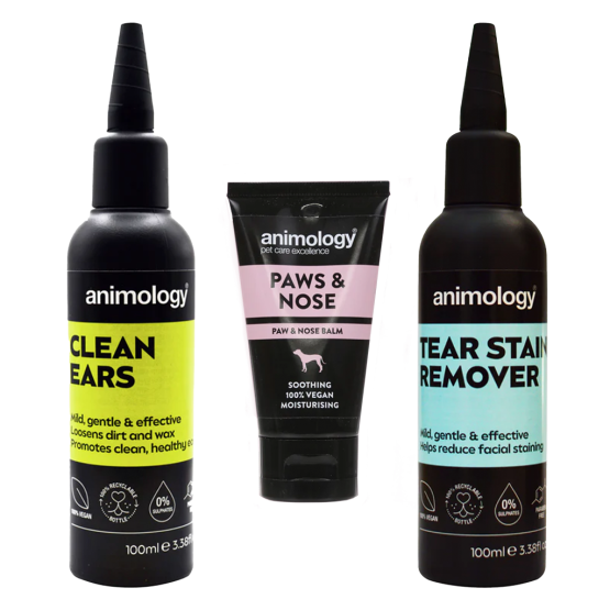 Deze set is samengesteld om de oren, ogen, voetkussentjes en neuzen van honden te verzorgen.