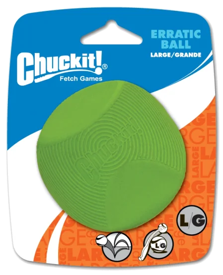 De Chuckit Erratic Ball biedt extra uitdaging bij het spelen met de bal. Door de hoekige vorm zal de bal niet in één rechte lijn rollen, maar juist alle kanten op stuiteren. De Erratic Ball is bovendien te combineren met de Ball Launchers van Chuckit (zie accessoires), wat het apporteren extra leuk maakt!