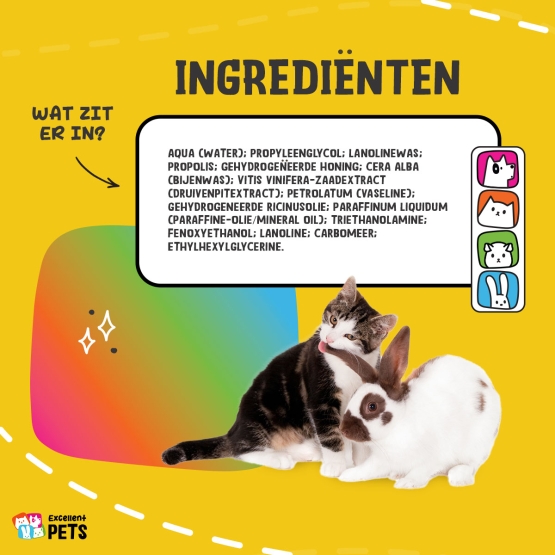 Excellent Pets Propolis & Honey Ointment bevat onder andere propolis en honing. Propolis, ook wel bijenlijm genoemd, is een natuurlijk product dat door bijen gemaakt wordt om het bijennest te verstevigen en voor goede hygiënische omstandigheden in het bijennest. Propolis heeft verzorgende eigenschappen en het ondersteunt het herstellend vermogen van de huid. Honing werkt eveneens verzorgend en het draagt bij aan het herstel van de huid.