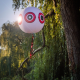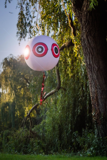 Glinsterende slingers aan de onderzijde van de ballon versterken het schrikeffect.