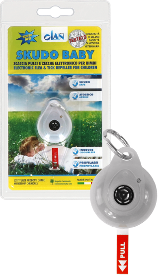 Aangezien kinderen gevoelig en kwetsbaar zijn, hebben ze soms extra bescherming nodig. Skudo Baby is de natuurlijke en veilige oplossing welke geen risico’s met zich meebrengt. Vlo-beten zijn vaak de oorzaak van allergische dermatitis,vanwege hun allergeenrijke speeksel. Het apparaat geeft een reeks ultrasone impulsen die de parasieten storen. Stoort mensen en huisdieren niet, waardoor kinderen die in parken, tuinen of met hun hond / kat spelen, beschermd blijven. De Skudo kan worden bevestigd aan de kinderwagen, de pols, de nek, (met het geperforeerde deel richting de huid). Zodra het rode lipje is verwijderd, werkt het apparaat continu voor 10/12 maanden dankzij een niet-oplaadbare batterij. Het is vocht-en waterbestendig en gebruikt geen vervuilende chemicaliën.