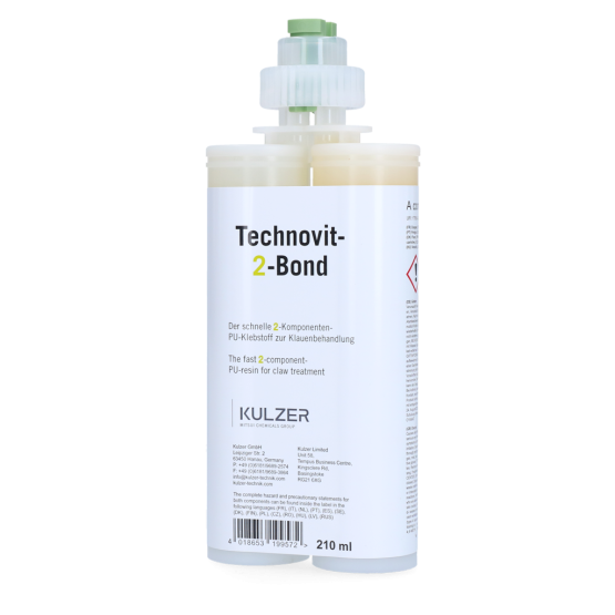 Technovit 2-bond is een snel hardende 2- componentenlijm, ontwikkeld voor het snel en gemakkelijk plaatsen van klauwblokjes. Deze sterke lijm komt in een handige verpakking met een speciale schenktuit. In deze tuit worden de 2 componenten gemengd. Dit zorgt voor een snelle en goede hechting in 30 seconden en maakt zelf mengen overbodig. Hierdoor is de lijm direct klaar voor gebruik! De aansluiting voor de schenktuit is groter en steviger uitgevoerd om het kapot gaan van de tube te voorkomen. Verdere fijne eigenschappen aan deze lijm: geen dampvorming en dit is een geurloos product. Dit is prettig voor zowel koe als behandelaar. Deze handige flacon bevat 210 ml en is goed voor 8 tot 10 behandelingen.