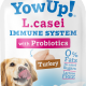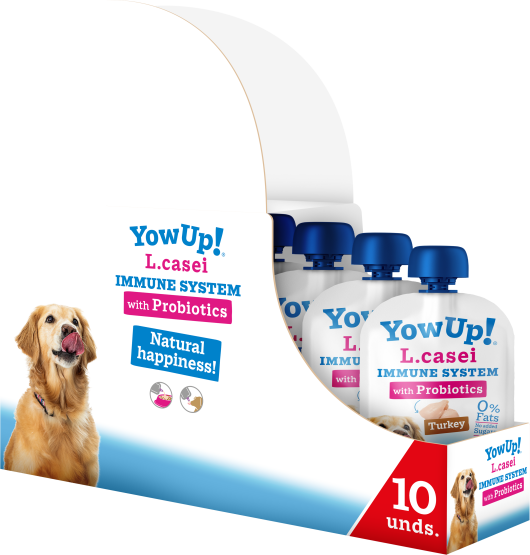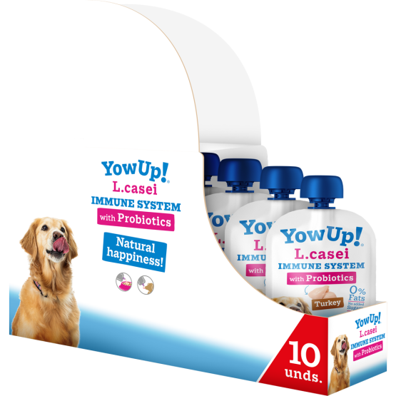 YowUp! L. Casei is de eerste gefermenteerde zuivel in de wereld, die niet koud bewaard hoeft te worden en die miljoenen actieve probiotica bevat, die het immuunsysteem en spijsverteringsstelsel van honden verbeteren. De formule bevat geen toegevoegde suikers, is lactosevrij en bevat 0% vet.