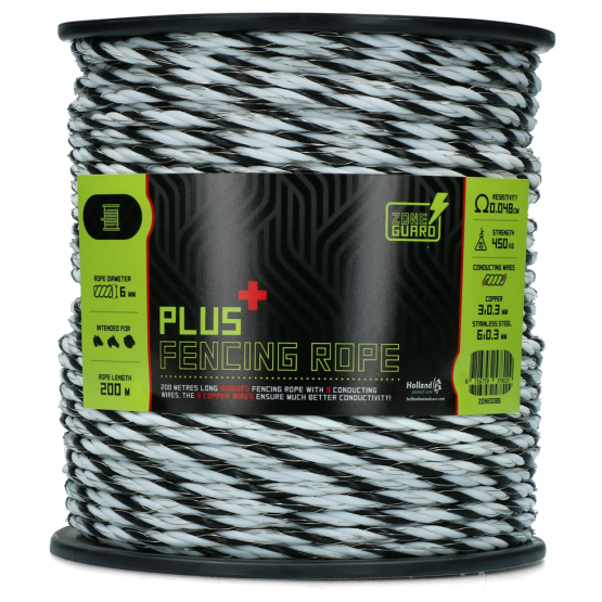 ZoneGuard Koord PLUS bevat roestvrij stalen draden en lichtmetalen draden. Roestvrij stalen draden zijn uiterst sterk, breukbestendig en duurzaam. Lichtmetalen draden zijn de perfecte stroomgeleiders. Deze combinatie biedt de beste geleiding.